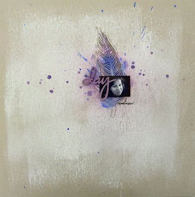 As you can see Louise has continued her love of using gesso on her background and chipboard elements. Once that was done, Louise used a Luminarte Paint dauber to provide the deep purple splat over the feather, and to finish off she has used a Tattered Angels chalkboard Glimmer mist in a lighter purple. Louise has also used Natalie May's wonderful chipboard title to finish off her layout.